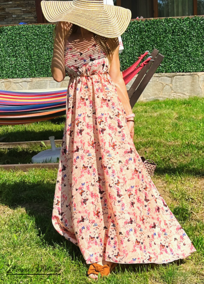 Лятна макси рокля с тънки презрамки в бледо розов принт