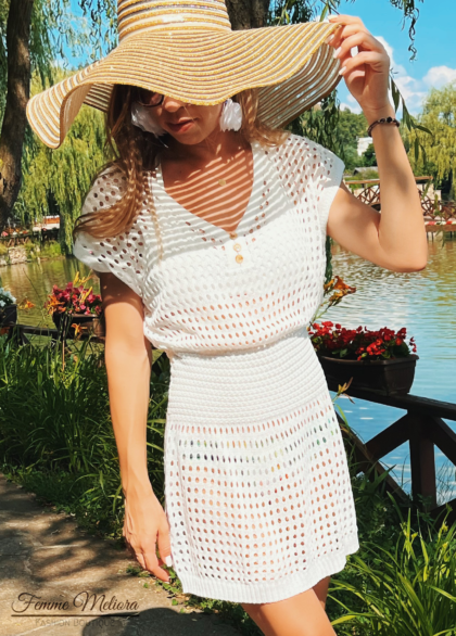 Плажна рокля с V-образно деколте и пискюли в бяло