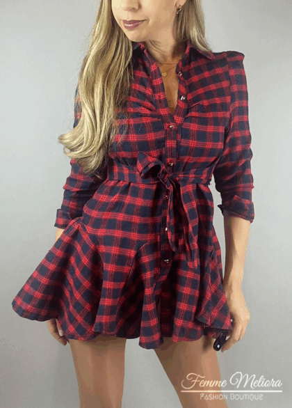 Разкроена мини рокля в кариран принт с дълъг ръкав и колан
